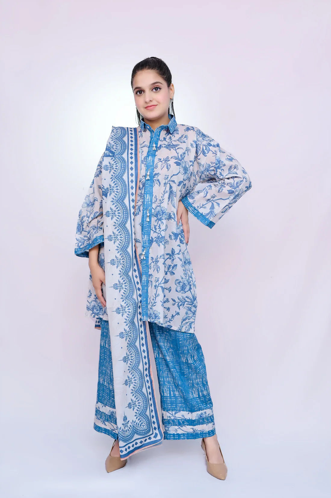 A coordinated voile dupatta with matching digital accents and classic trousers complete the look, making it perfect for relaxed daytime outings, casual elegance, or a serene summer style statement.