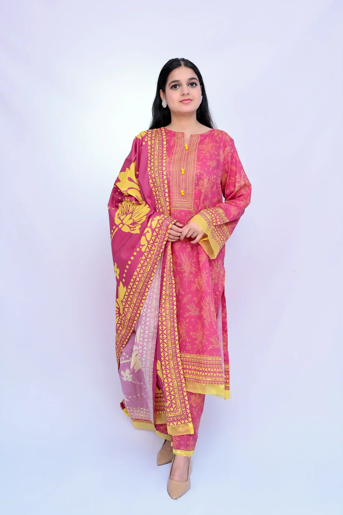 A matching voile dupatta and coordinated trousers complete the look, making it an ideal choice for semi-formal events, daytime gatherings, or adding a sophisticated touch to your everyday style.